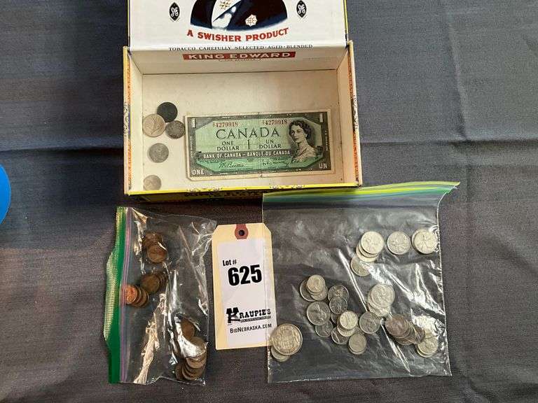 Assorted Canadian Currency, $1 bill, 28 Pennies, & few other foreign Coins