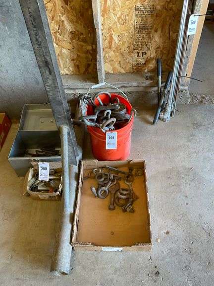 LOT 207 - Bucket of Meat Hooks, Pulleys, Eyelets