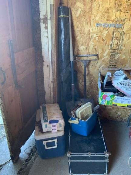 LOT 382 - Shovel, Sturdi Flex Mortar, Dust Pans and Newer Luggage Trunk