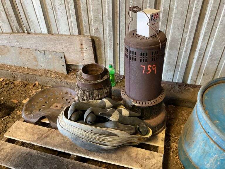 Wagon hub, steel seat, kerosene stove, decoys