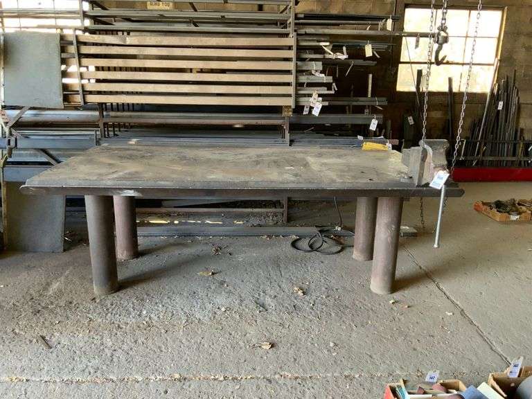 LOT 155 - Large Welding Table With 6" Vise, 8'10" x 5' 36", 3/4" Thick