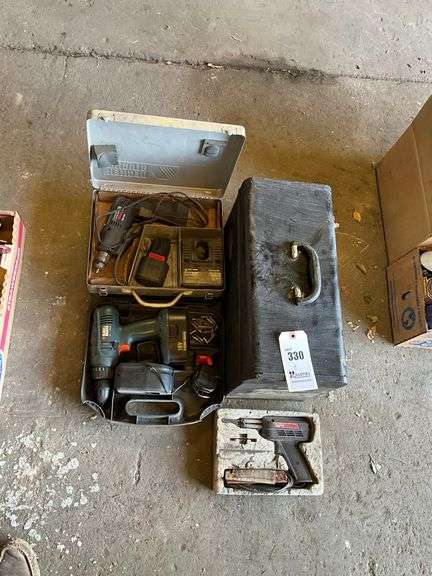 LOT 330 - Two 1/2 Drills, Tool Box, Soldering Iron